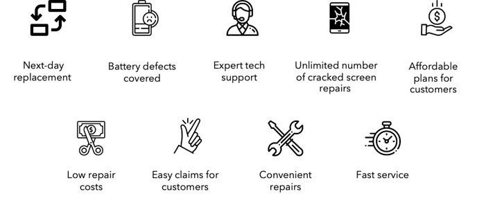 Covers loss, theft, and accidental damage, including cracked screens and liquid damage. This protects customers from costly, unexpected events and gives them confidence to upgrade devices more often, driving higher satisfaction and repeat business.