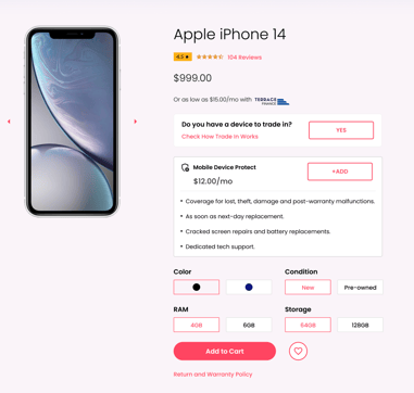 Discover: Customer visits the eCommerce store, selects a new device, and sees Mobile Device Protect displayed on the product page. While adding the device to their cart, the customer chooses Mobile Device Protect.