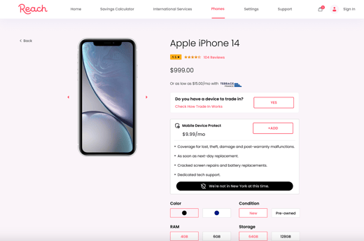 When browsing a new device, the customer sees the option to trade in their existing device. With a few quick questions answered, they receive an instant estimated trade-in value.